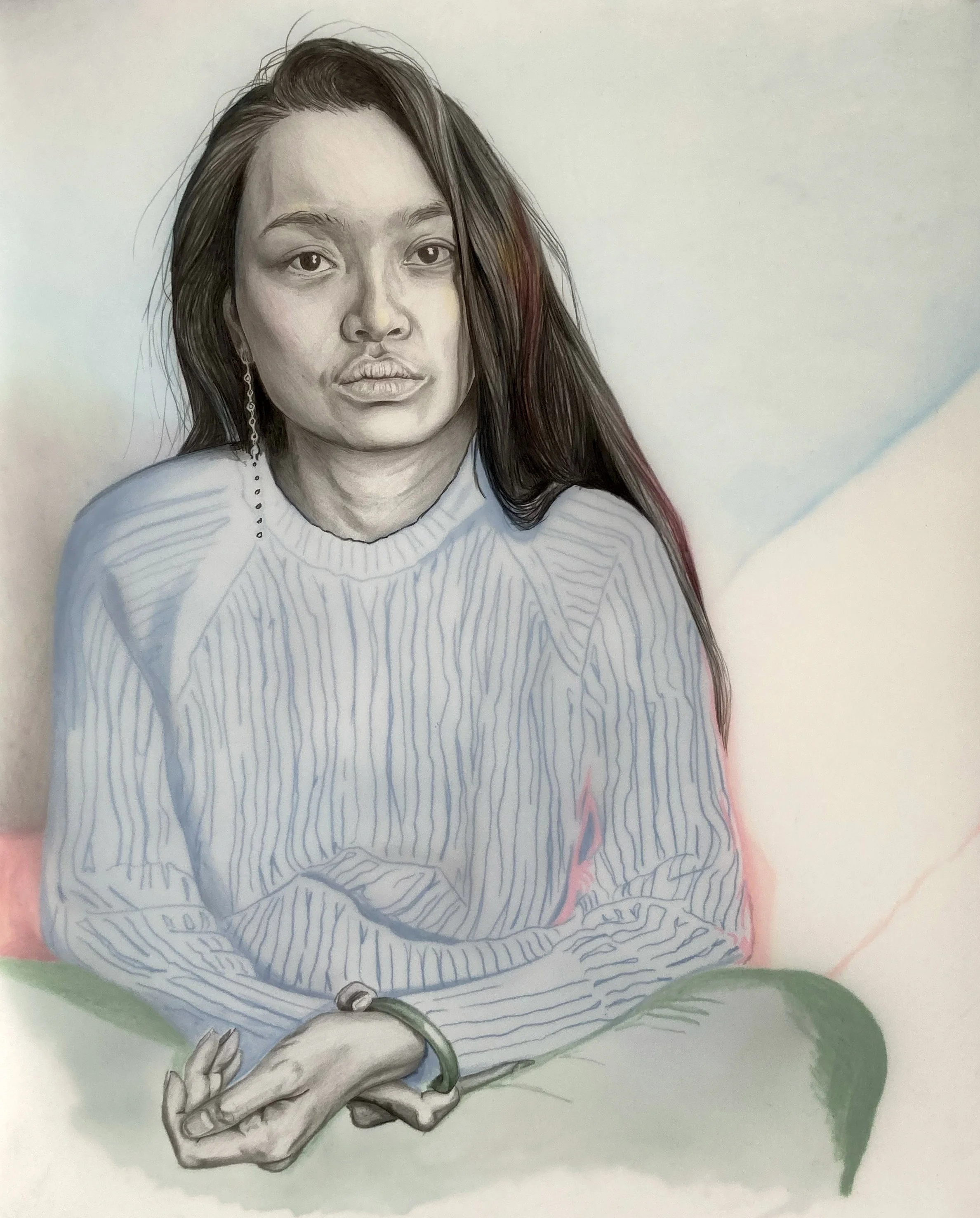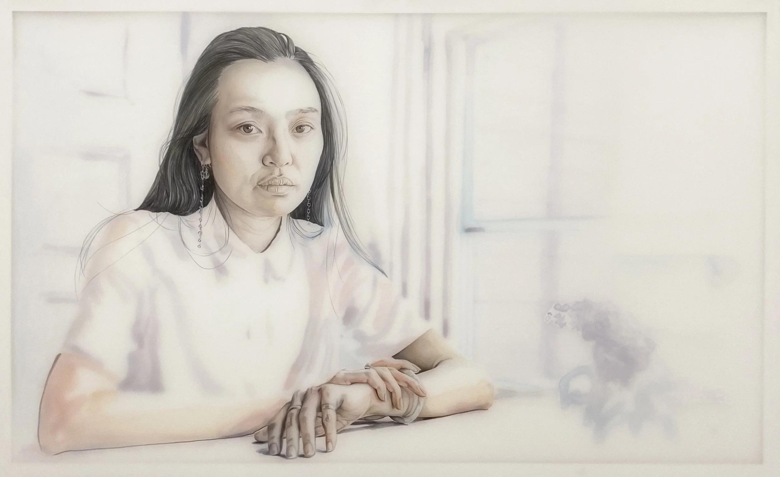 Thilini Sitting in front of Glass Doors, Pencil, Watercolour and Ink on Mylar, 40 x 60”, 2023